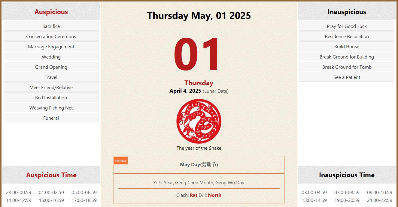 May 01, 2025 Almanac Calendar Auspicious/Inauspicious Events and Time , Choose auspicious dates for wedding, marriage in 2025 online for free based on chinese almanac calendar.